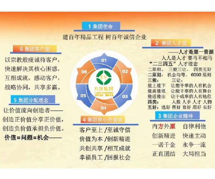 楊董事長指出,企業文化是一個企業的根脈,是一個企業基業長青的立身之本。集團公司一直秉承著“建百年精品工程,樹百年誠信企業”的集團使命,踐行“客戶至上,至誠守信;價值為本,創新精進;共創共享、相互成就;幸福員工,回報社會” 的企業核心價值觀,始終堅持 “人人是人才,賽馬不相馬” 的人才觀,始終堅持“讓價值流向創造者”的價值分配理念,讓創造者吃虧;方原集團:內方外原(如LG圖型),方原指的是-- 方:(內部 )方正規矩,品格正直,公正簡單,有原則有底線;原:(對外)原本初心,胸懷寬廣,大氣正義,有格局有擔當。(嚴以律己,寬以待人)