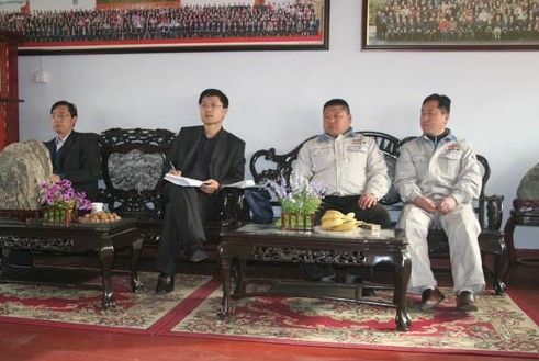 市工商局鄭金鐘副局長(右一)和工商聯王萍部長(左二)與總經理楊明波深入交談