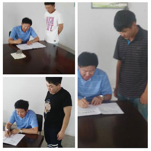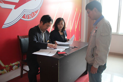 會議簽約環節,由每位轉正人員填寫勞動合同再由副總經理趙建軍簽字副總經理榮祥峰蓋章,簽訂勞動合同。